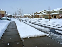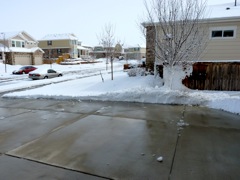 When it finally stopped snowing (around 1PM on the 24th), we'd accumulated appx 12 inches in our neighborhood (South-east Aurora). Clearing that driveway was quite a chore. The snow was extremely wet and heavy. My little Yard King/Murray/Tecumseh Snow Thrower just couldn't handle it. I struggled for over an hour to clear a quarter of the driveway. When the gas ran out, I finally fired up my new Ariens/Briggs & Stratton Sno-Thro. That bad-boy has a much larger engine, a bigger intake, and a six speed drive system. Once I got the new snow blower running, I was able to clear the driveway and sidewalks with minimal effort.
